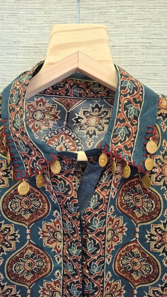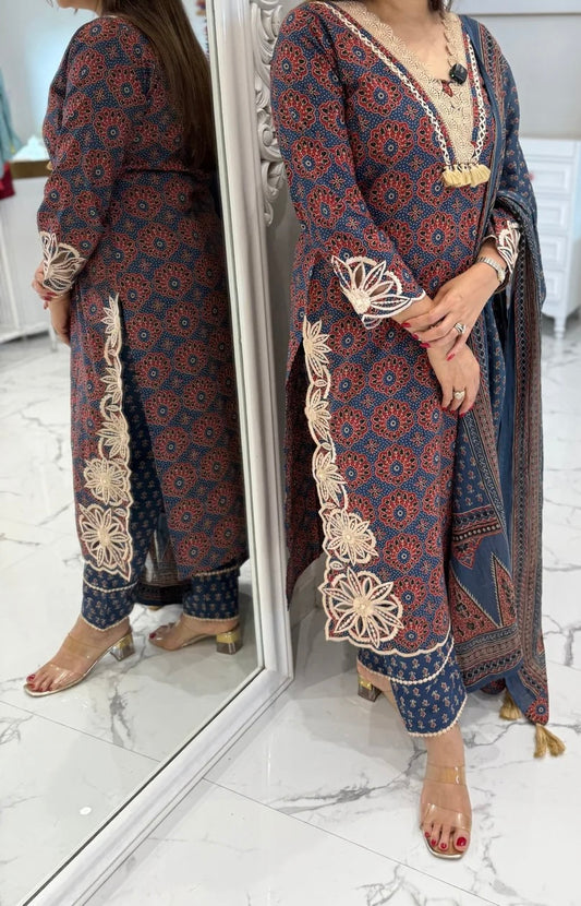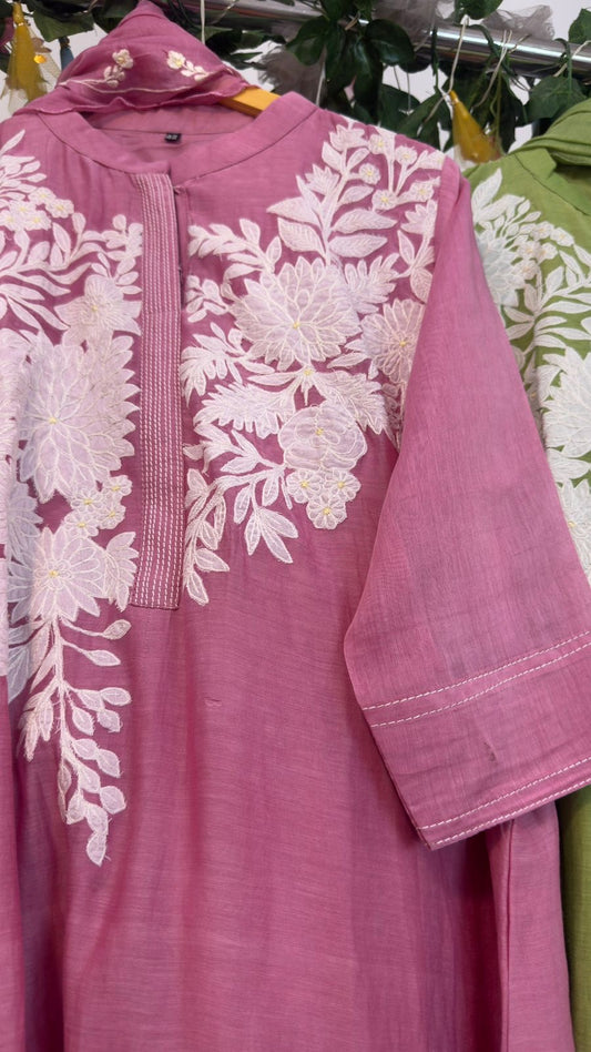 Summery mul chandari Anarkali with appliqué detailing in dup with cotton silk pants