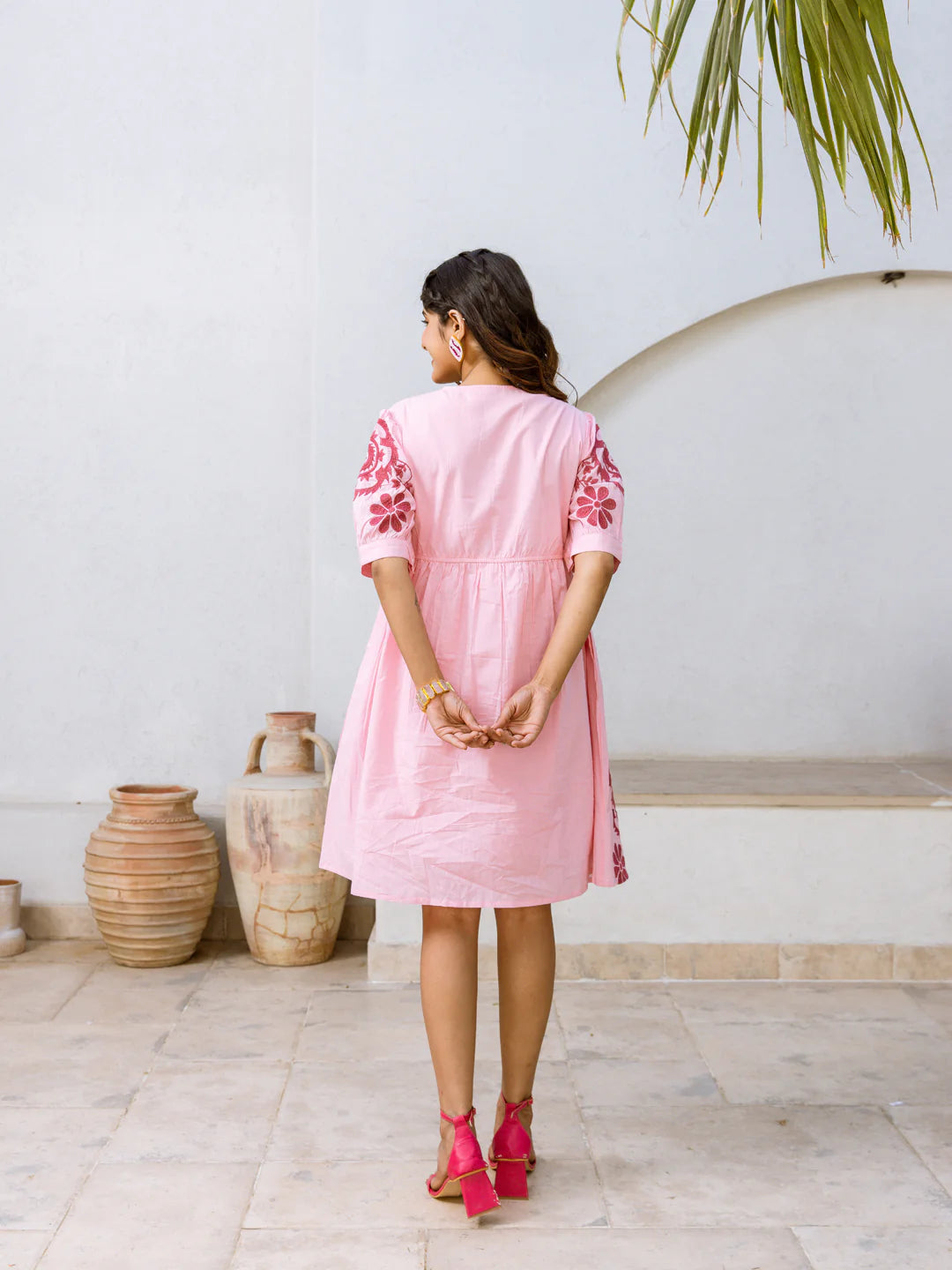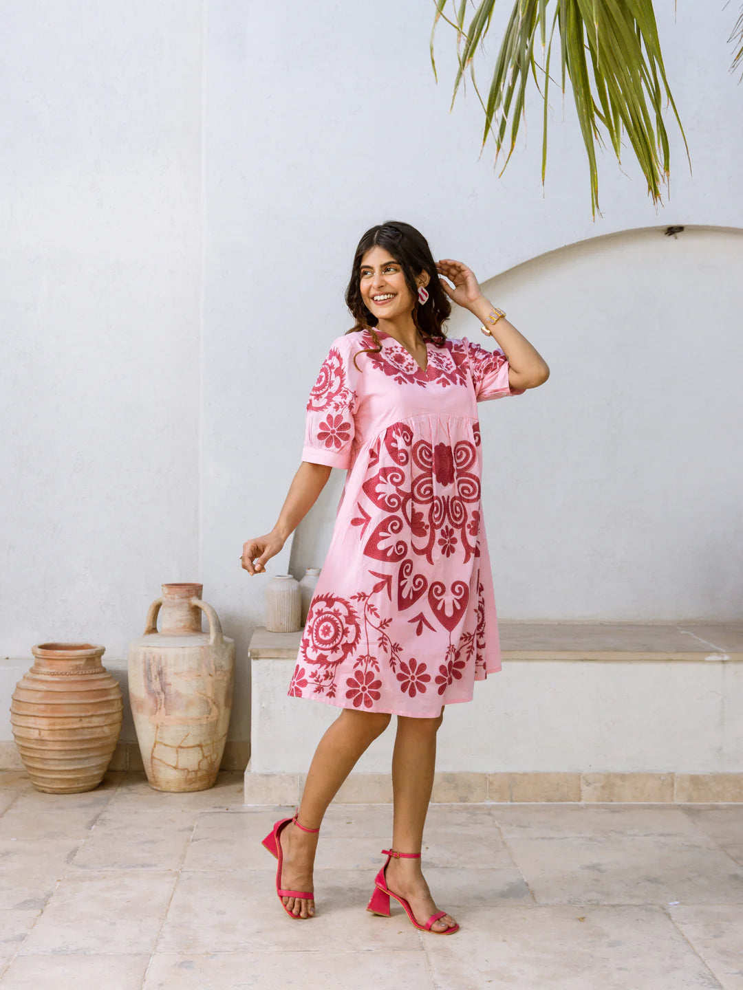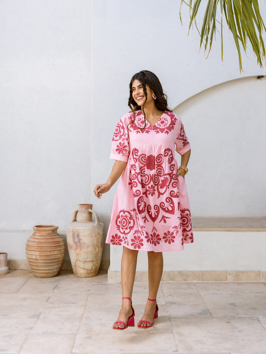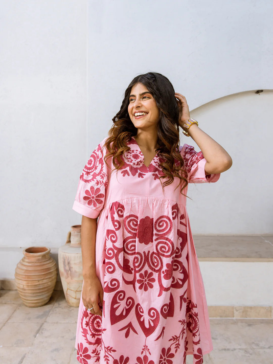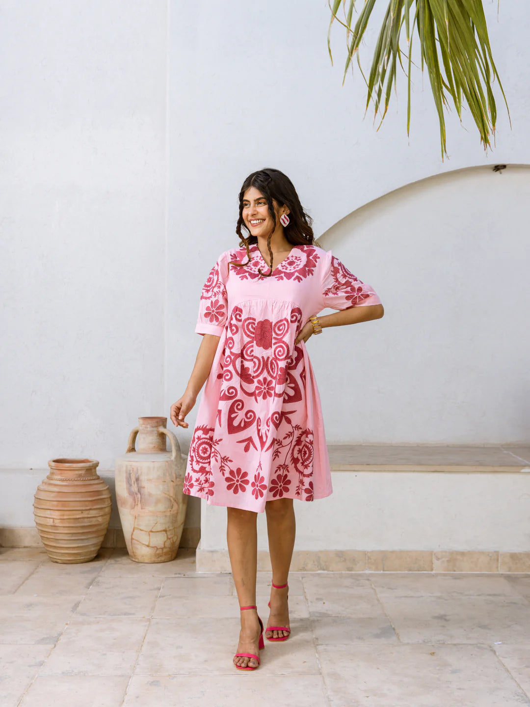 This playful pink midi dress is adorned with bold, symmetrical floral block prints in deep red, creating a lively, cheerful aesthetic. Perfect for sunny outings, it’s made from breathable fabric to keep you cool and radiant.