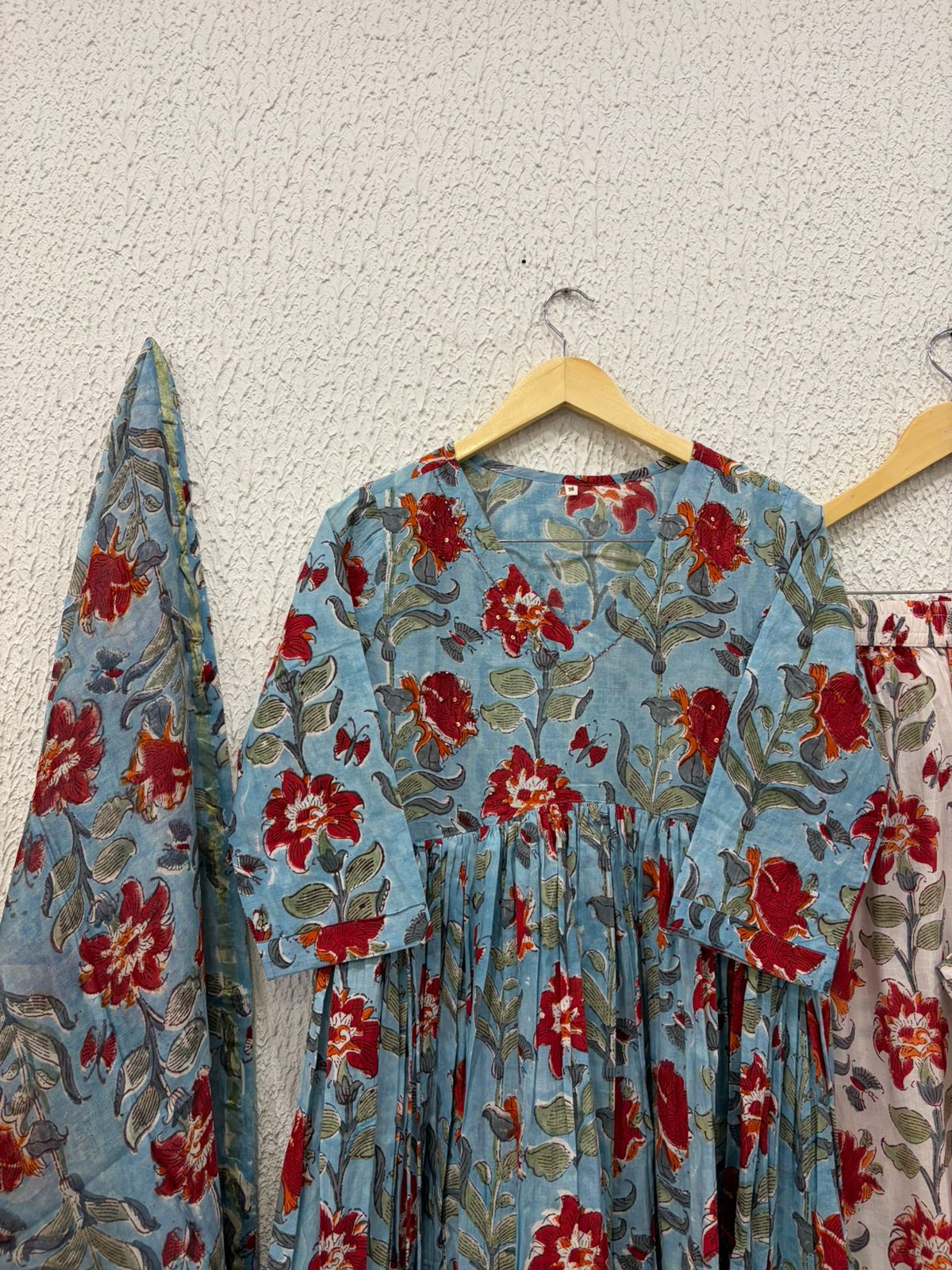 Blue red flower handblock print Cotton Anarkali pants with chandari dupatta