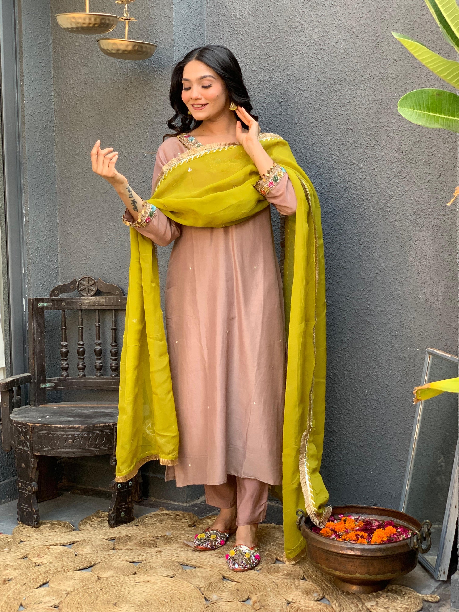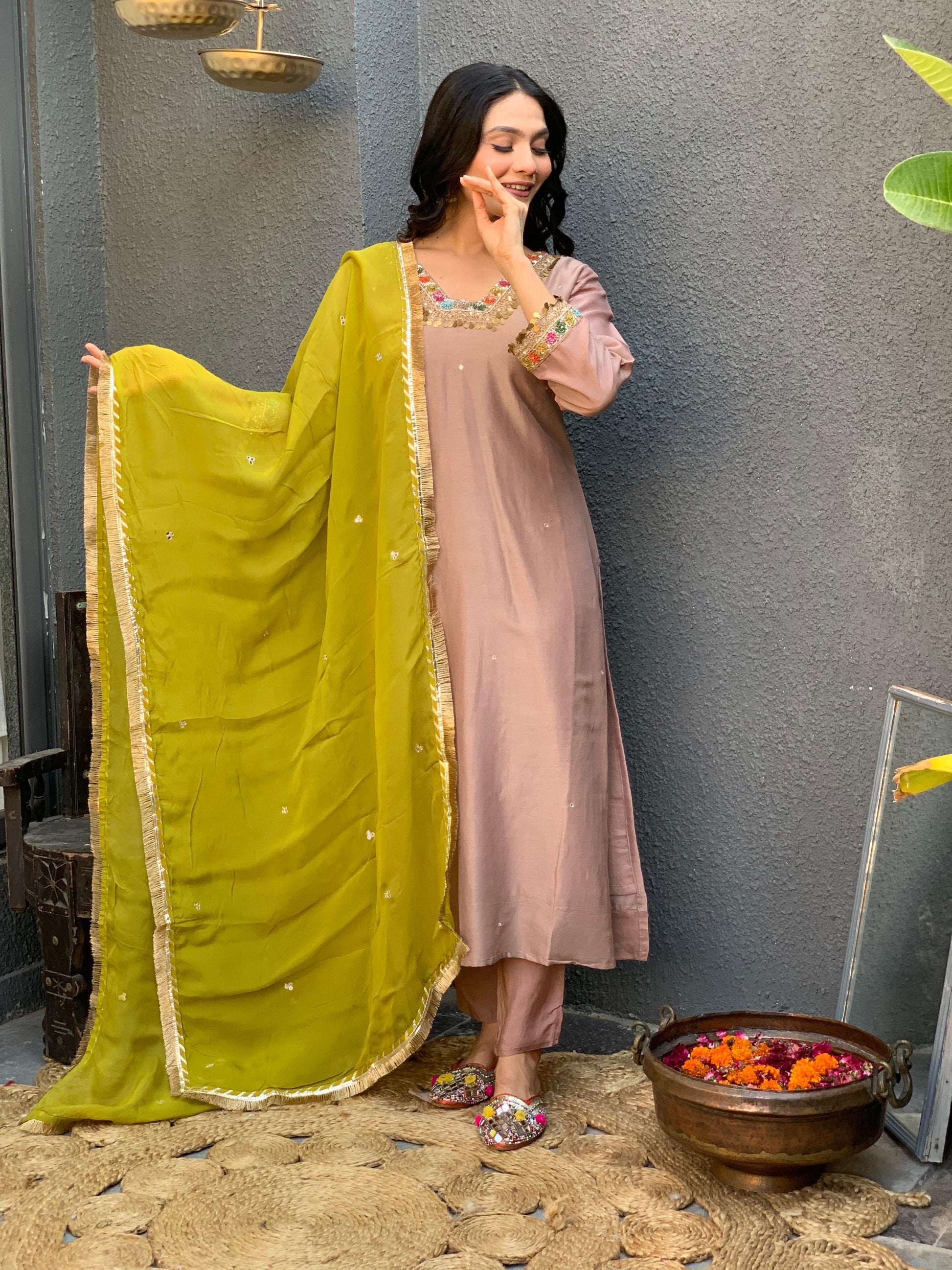 Brown square neck silk suit