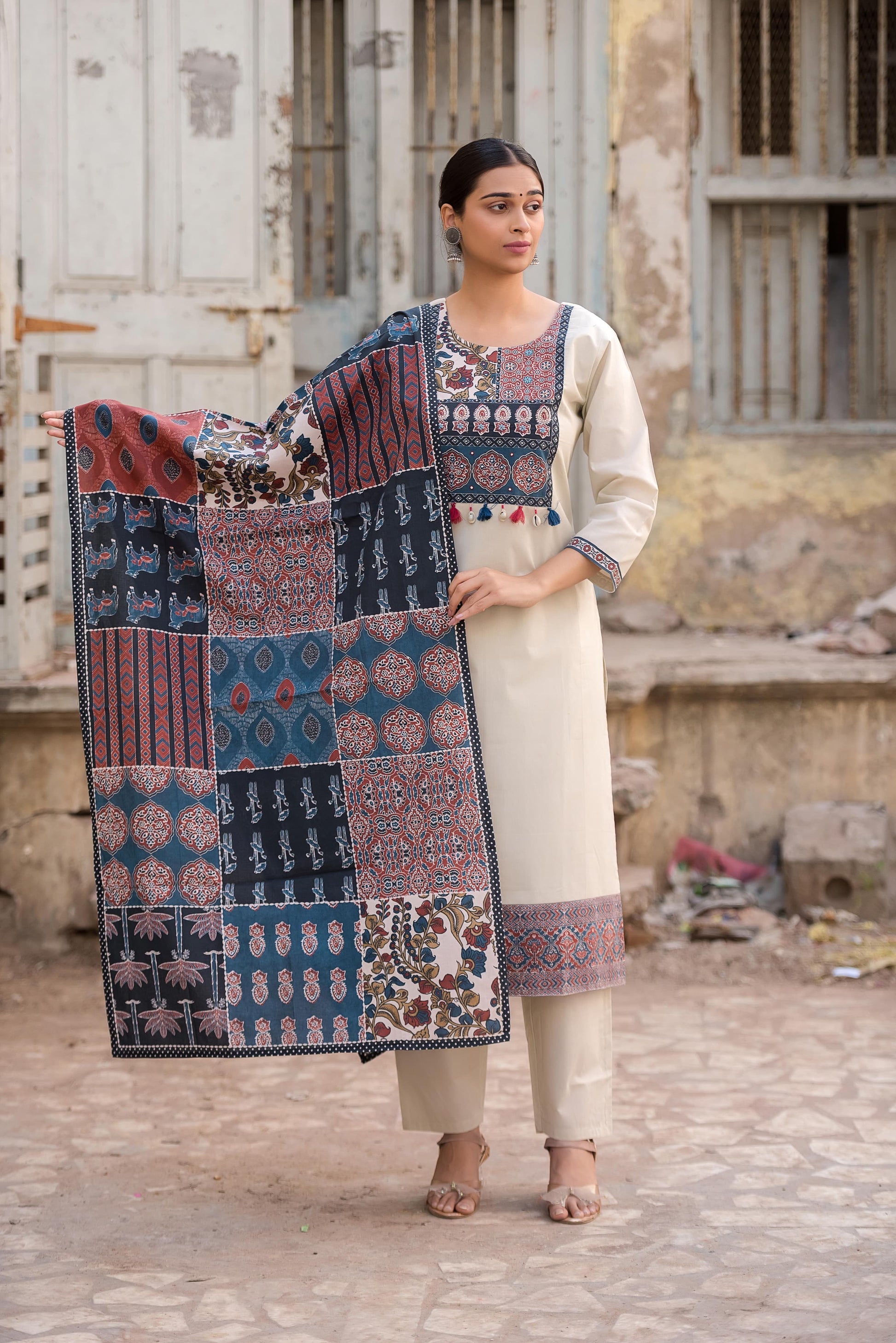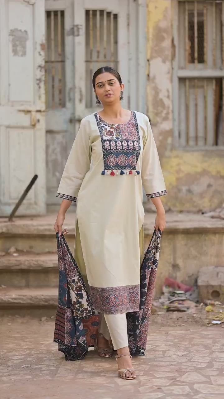 Cream kutch ajrakh cotton Set