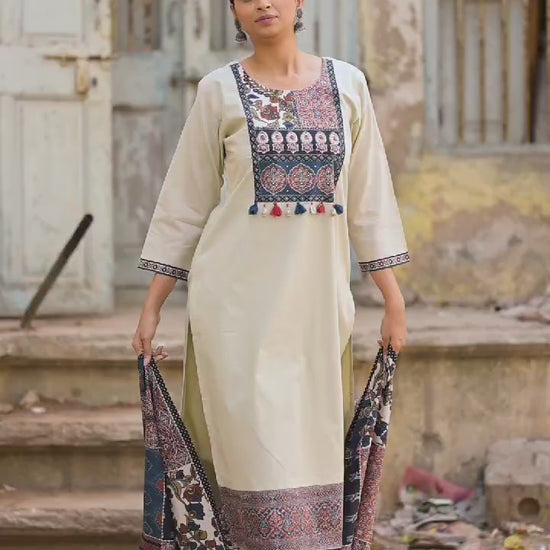 cotton straight pants set featuring Kutch appliqué and along with a soft pure mul dupatta.