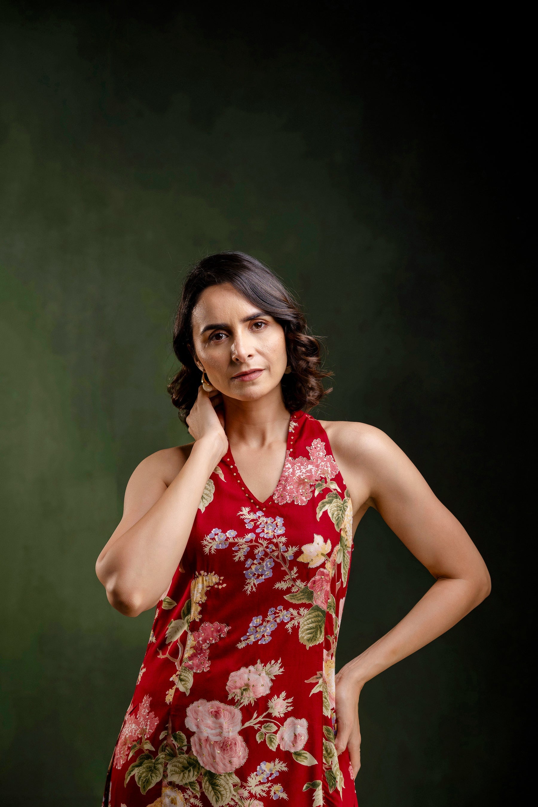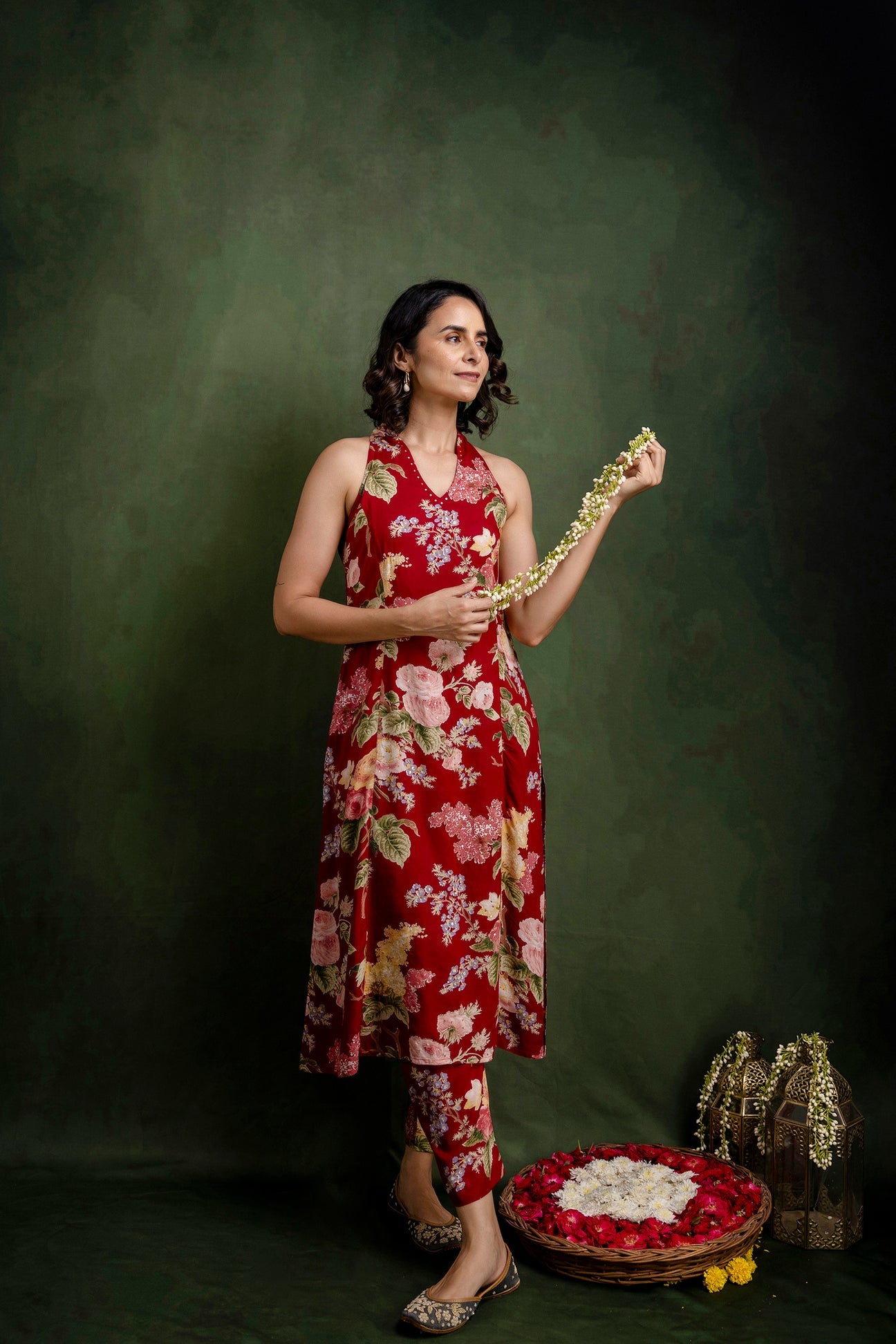 Maroon Printed Modal Embroidered Co-Ord Set. Crafted from luxurious modal fabric, this set features a rich maroon hue, beautifully enhanced with a subtle print that exudes sophistication. The exquisite sequin and zari embroidery work on the neckline and sleeves.
