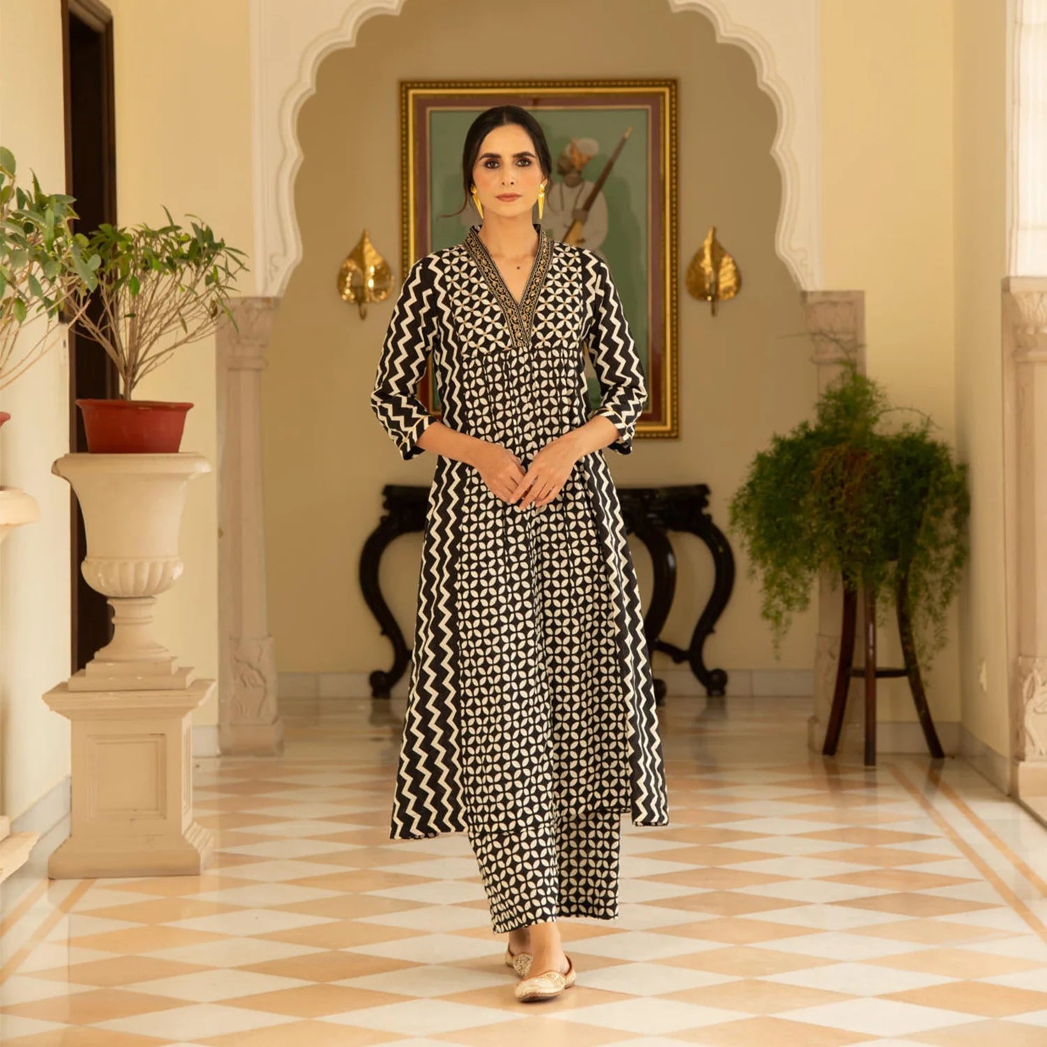 Monochromatic black A-Line Embroidered Kurta Pant Indian Co ord