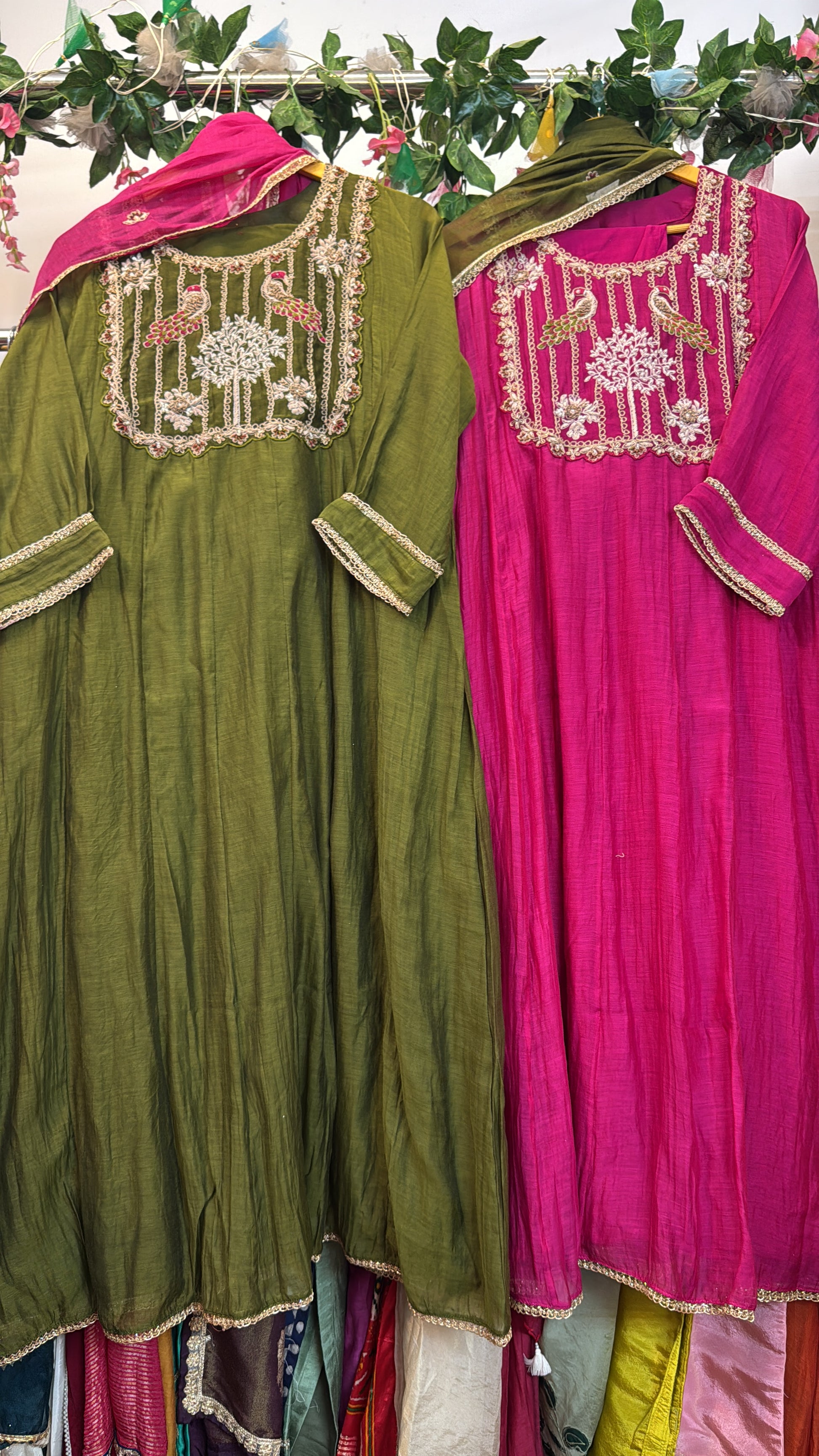 Morni handwork contrast colour mul chandari suit