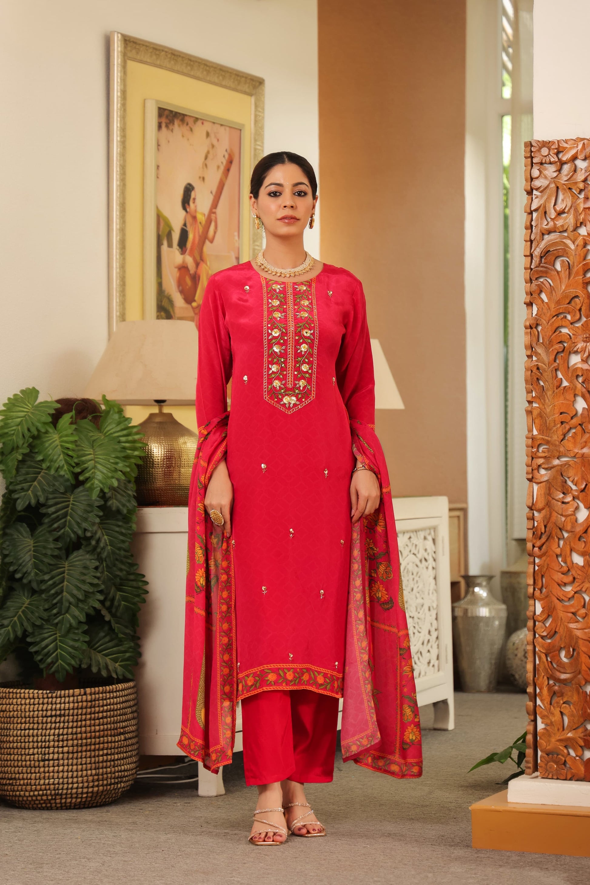 Pink pure crepe suit with chiffon Dupatta and muslin pants