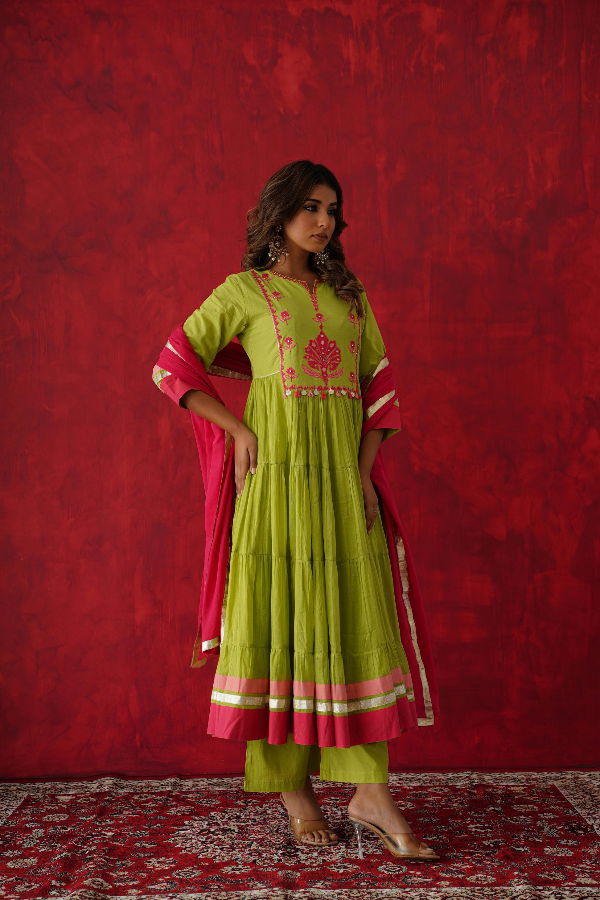 Pure green mul cotton Anarkali with real mirror embroidery