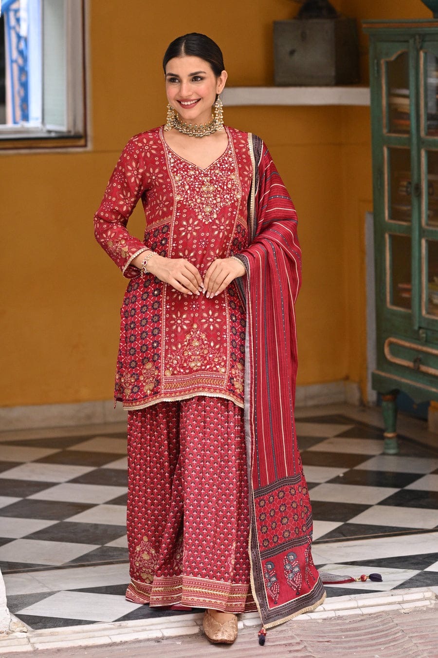 Red Block and Placement with Gold Foil Print Muslin Sharara Set with sequence , Moti and Gota work