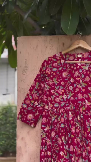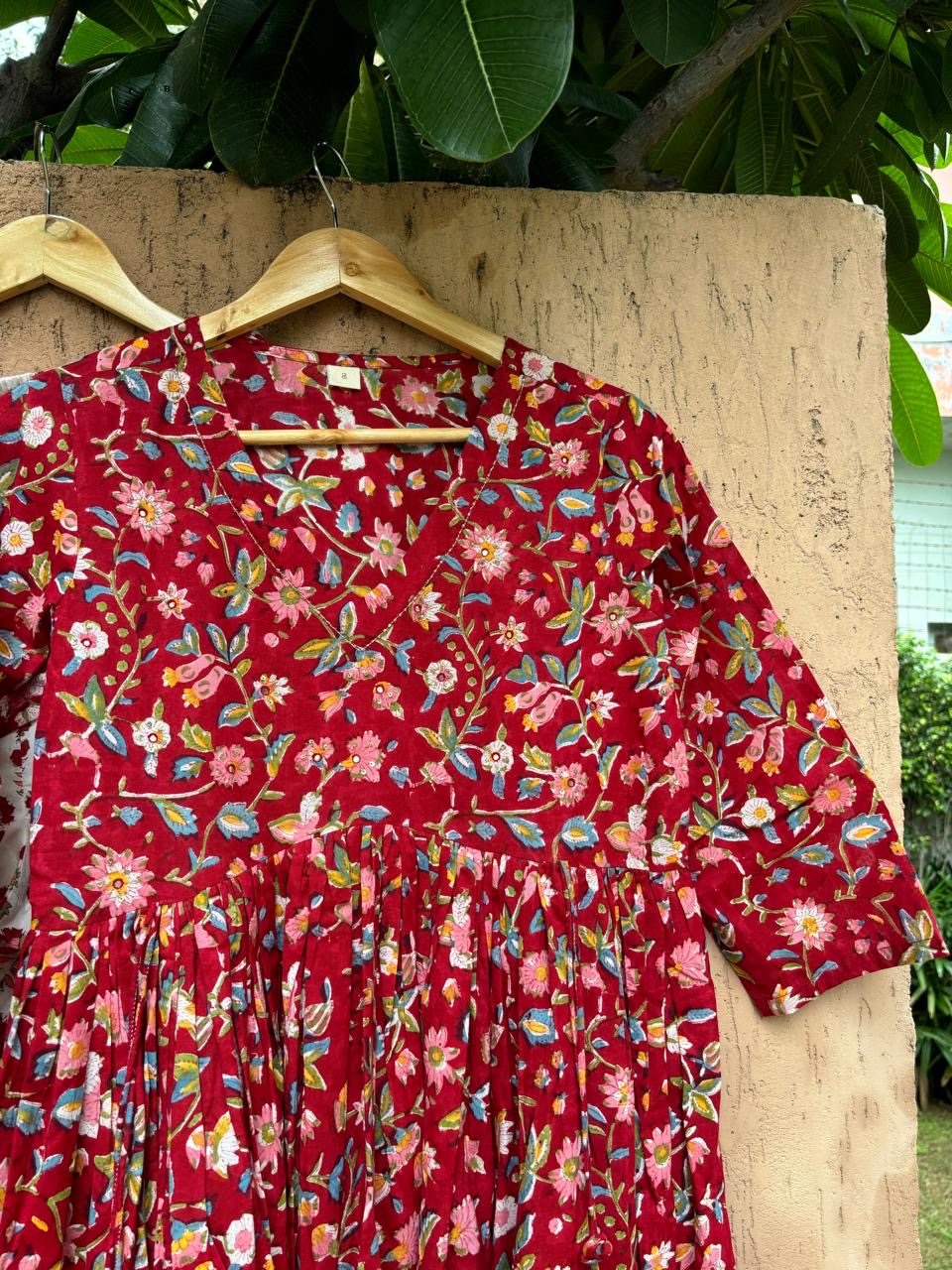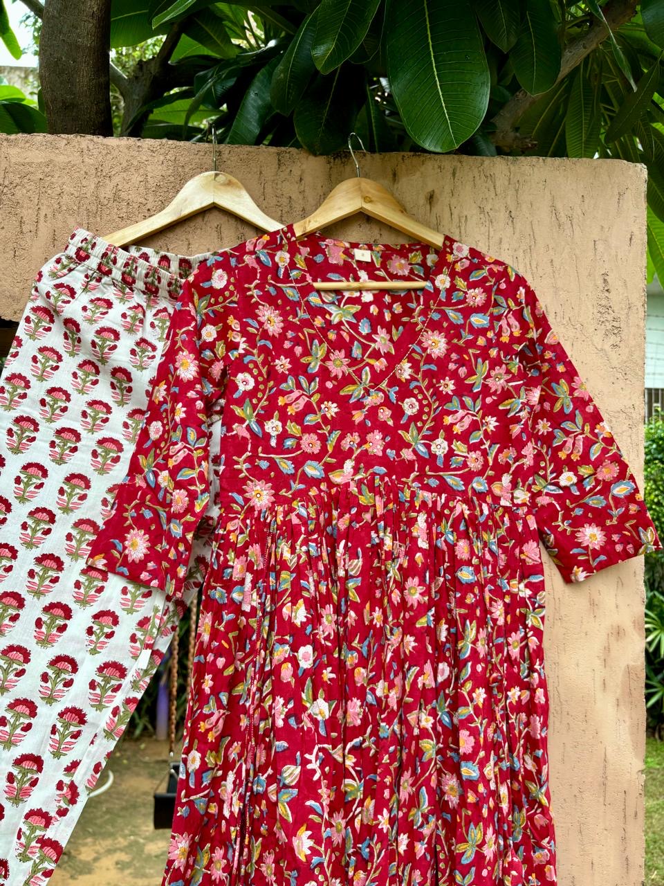 Red hand block premium cotton Anarkali pants paired chandari Dupatta