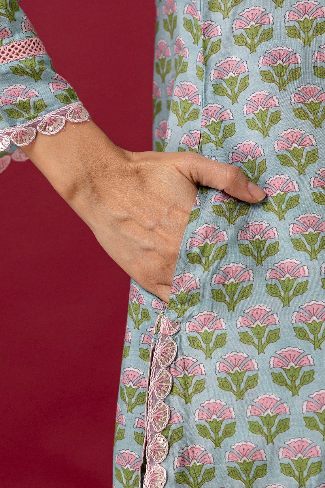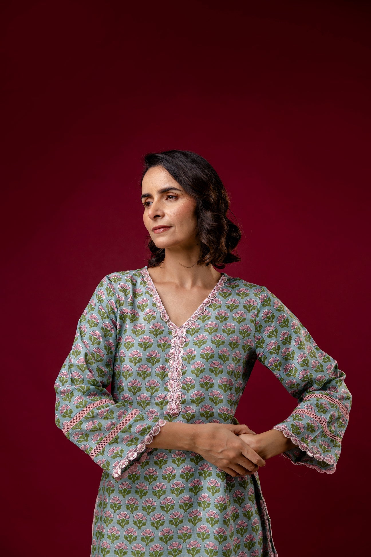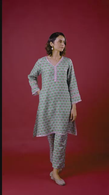 Sea Green Muslin Comfort Fit Co-Ord Set with Embroidered Laces