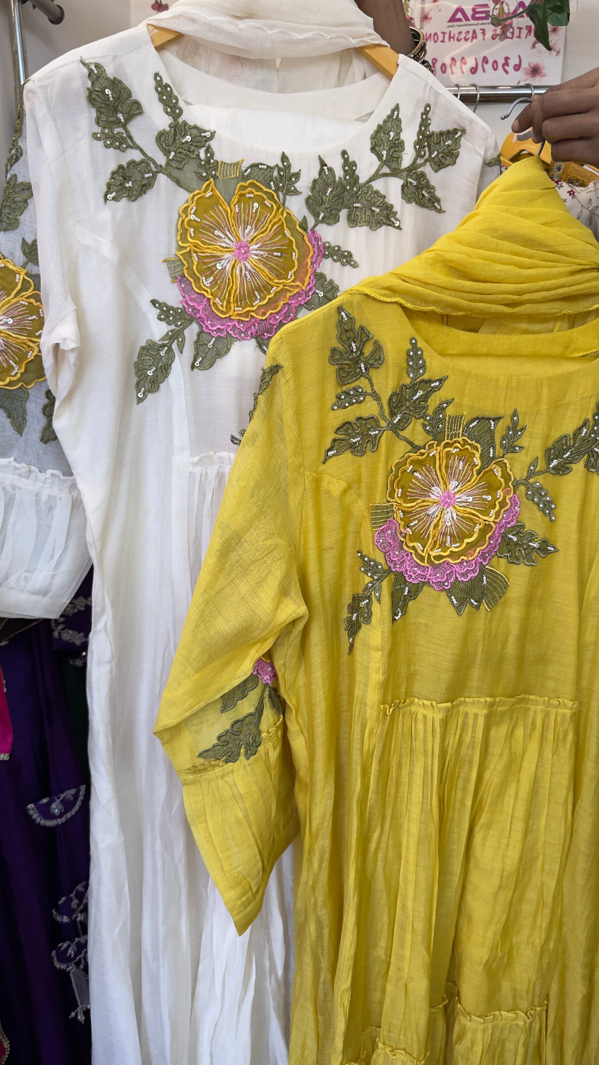 Summery mul chandari Anarkali with appliqué detailing in dup with cotton silk pants
