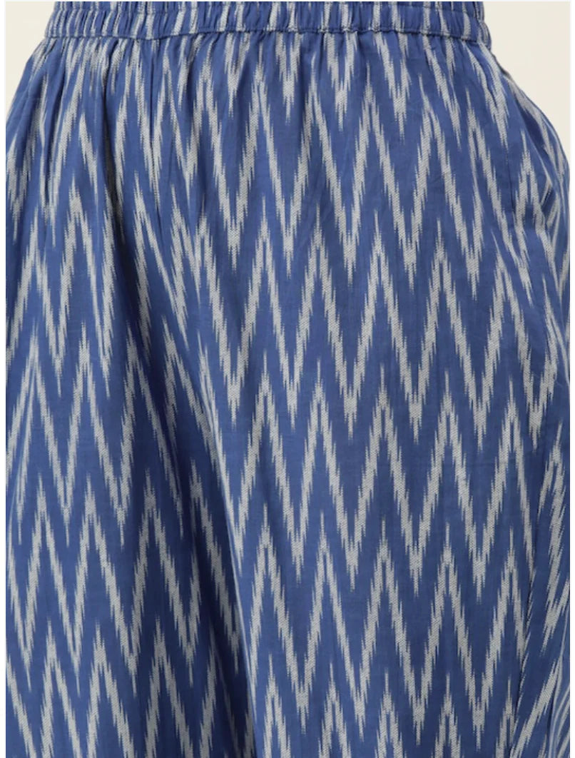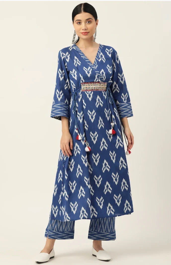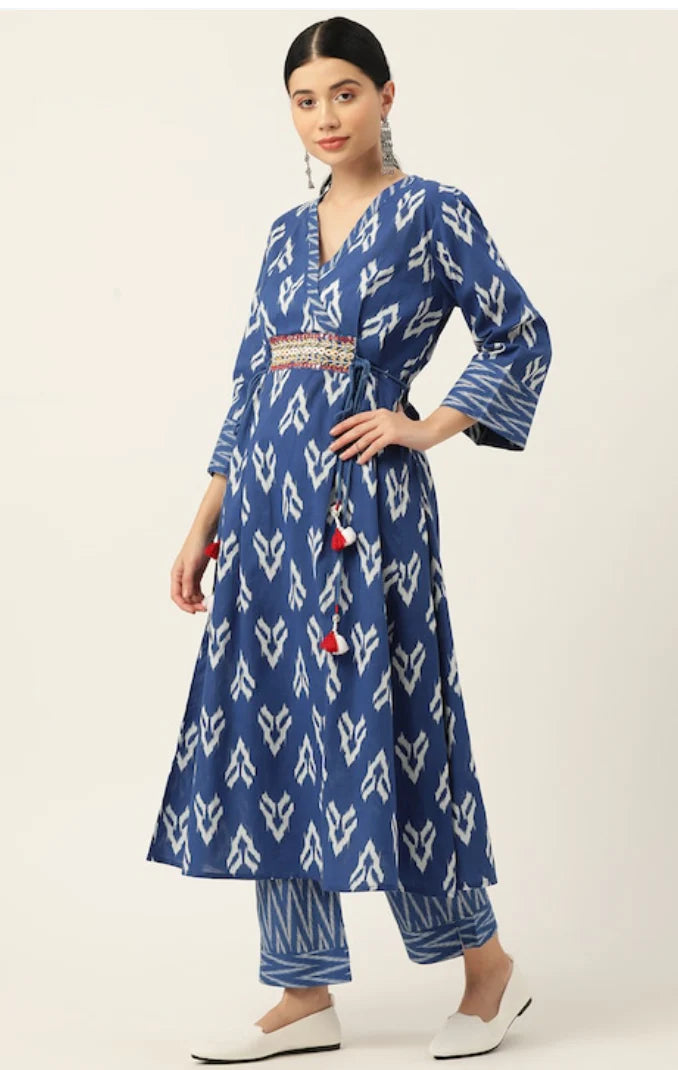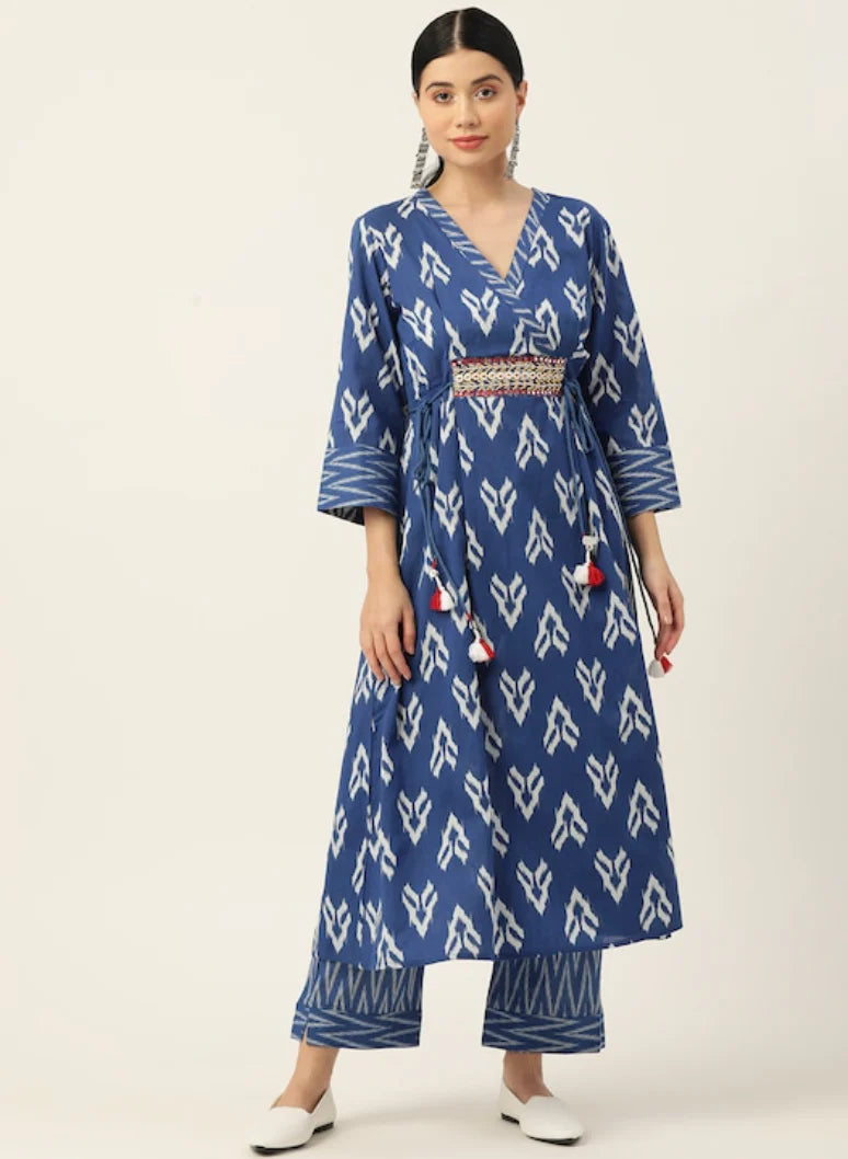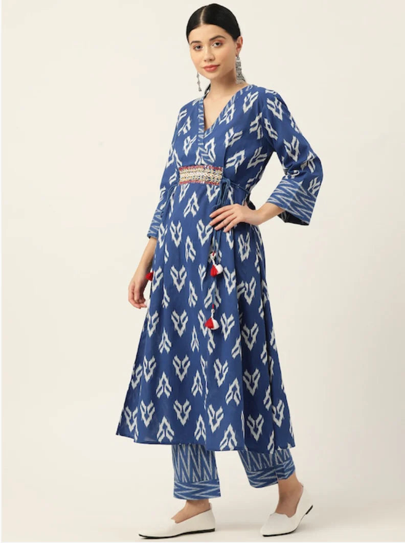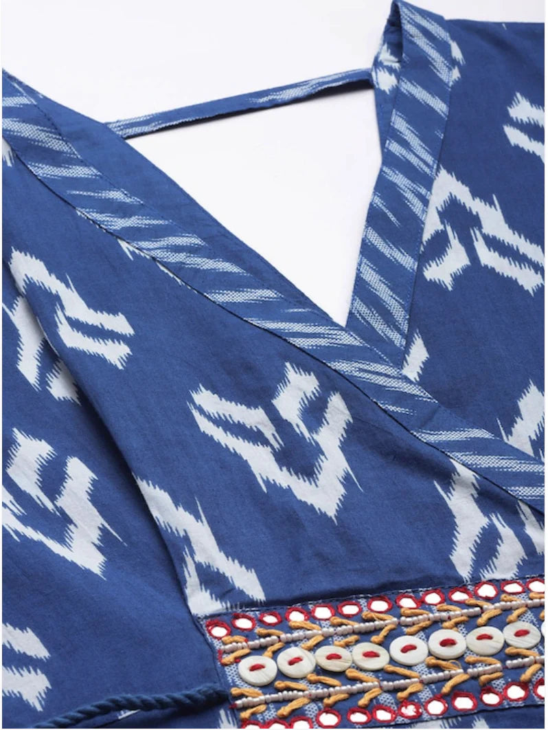 Women Blue Printed Angrakha Beads & Stones Pure Cotton Kurta with Trousers